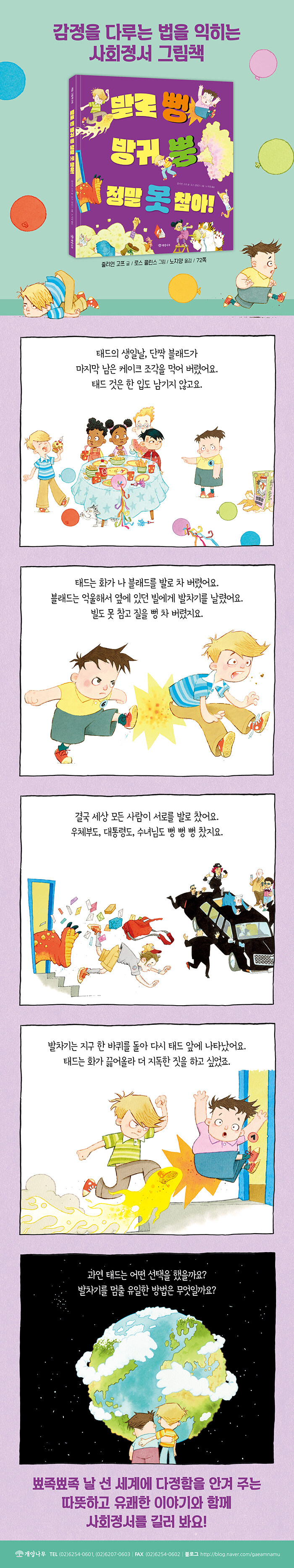 이 책의 주인공 태드는 생일날 단짝 친구 블래드를 발로 차고 맙니다. 마지막 남은 케이크 조각을 블래드가 먹어 버렸거든요. 블래드는 화가 나 빌에게 발차기를 날렸어요. 빌도 못 참고 쌍둥이 동생 질을 뻥 찼지요. 질은 원망스러워 태드 엄마를 발로 밀어 버렸어요. 사람들은 서로를 차고 또 찼어요. 우체부도, 대통령도, 수녀님도 서로를 뻥 뻥 뻥 찼지요. 발차기는 그렇게 지구 한 바퀴를 돌아, 다음 해 생일날 태드를 다시 찾아왔어요. 지독한 방귀가 되어서 말이죠! 그때 태드는 기막힌 생각을 떠올리고는 나무 위로 올라가 묻습니다. ‘지금 내 기분이 어떻지?’ 그러고는 천천히 숨을 고릅니다. 불편한 감정을 가라앉혀야 기막힌 생각을 실행에 옮길 수 있으니까요.