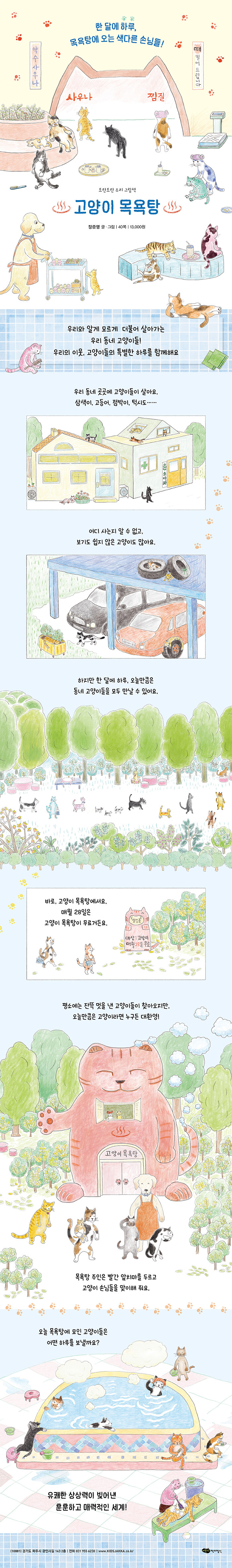 한 달에 하루, 목욕탕에 오는 색다른 손님들!특별한 하루를 보내는 우리 동네 고양이들한 달에 하루, 매월 28일이면 우리 동네 고양이들은 모두 ‘고양이 목욕탕’에 모여요. 평소 목욕탕을 주로 찾는 손님은 목걸이며 장신구로 잔뜩 멋을 내는 고양이들이에요. 조금은 예민하고 까다로운 손님들이죠. 하지만 28일만큼은 동네 곳곳에서 자유롭게 살아가는 온갖 고양이가 약속이나 한 듯이 모두 고양이 목욕탕을 찾아와요.