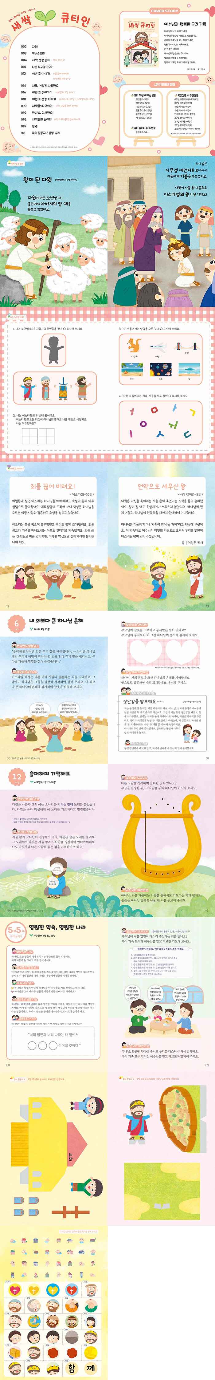 아이들을 위한 읽을거리신나는 ‘새큐송’과 예쁜 그림으로 접하는 ‘새싹 성경 동화’를 제공합니다. 또한 ‘이번 호 이야기’를 통하여 이번 호의 큐티본문을 전체적으로 쉽게 이해할 수 있도록 돕는 읽을거리가 있습니다.