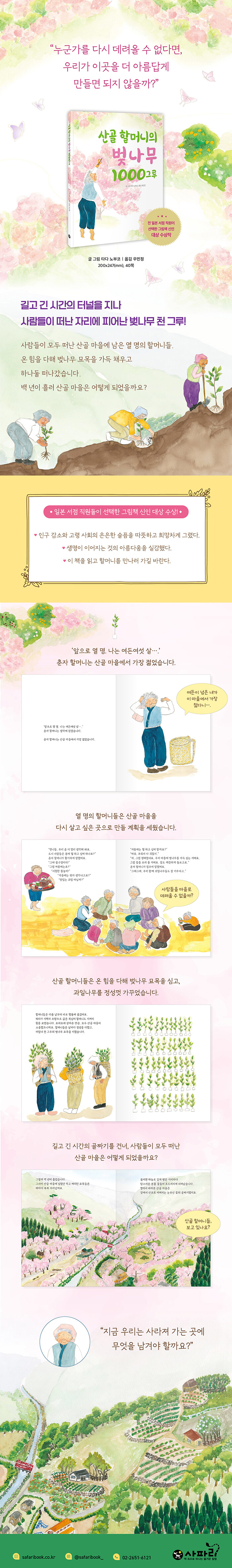 《산골 할머니의 벚나무 1000그루》는 사람들이 떠나 사라질 위기에 처한 공동체와 자연의 소중함을 통해 우리 현실을 돌아보게 하는 그림책입니다. 지금 우리 사회가 마주한 질문을 조용히 그러나 묵직하게 건네지요. 산골 할머니들은 "우리는 사라져가는 곳을 그냥 두고 떠날 것인가, 아니면 그곳에 다시 무엇인가를 남길 것인가."라는 끝없는 질문과 고민 끝에 천 그루의 묘목을 심어 누구나 찾아오고 싶을 만큼 아름다운 마을을 만들었어요. 한 그루의 나무는 작지만, 백 그루의 나무는 풍경을 바꾸고, 천 그루의 나무는 마을의 시간을 바꾸었습니다.