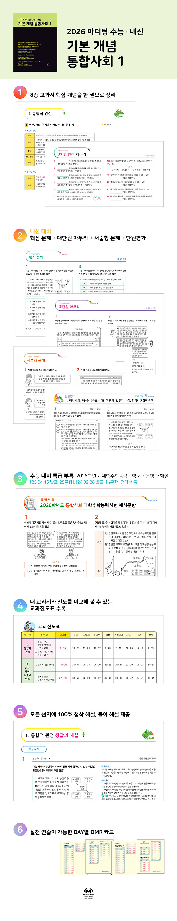 8종 교과서 개념을 한 권으로 총정리하고, 내신 필수 문제 365문제와 OX&단답형 322문제, 서술형 43문제를 수록했다. 2028학년도 대학수학능력시험 예시문항[25.04.15 발표-25문항], [24.09.26 발표-14문항]과 해설도 함께 담았다.