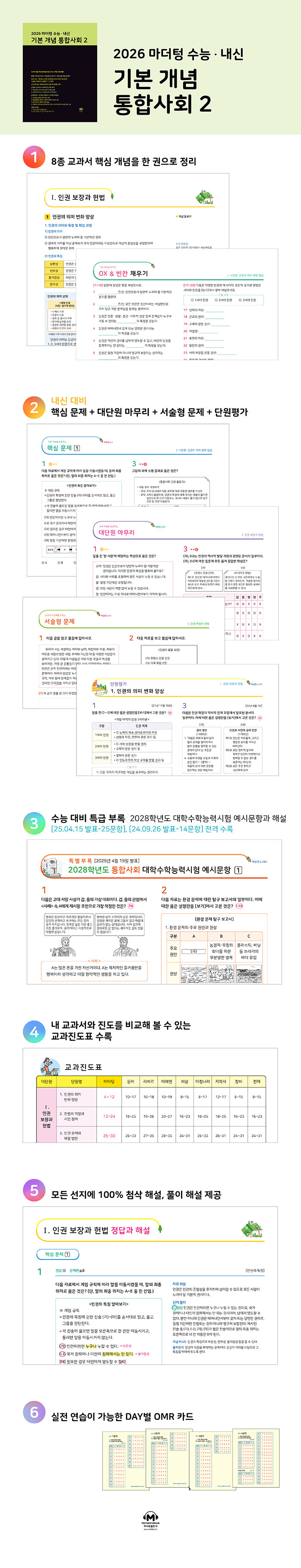 내신 필수 문제 409문제, OX&단답형 380문제, 서술형 48문제, 단원평가 121문제를 수록했다. 2028학년도 대학수학능력시험 예시문항 [25.04.15 발표-25문항], [24.09.26 발표-14문항]과 해설도 함께 담았다.