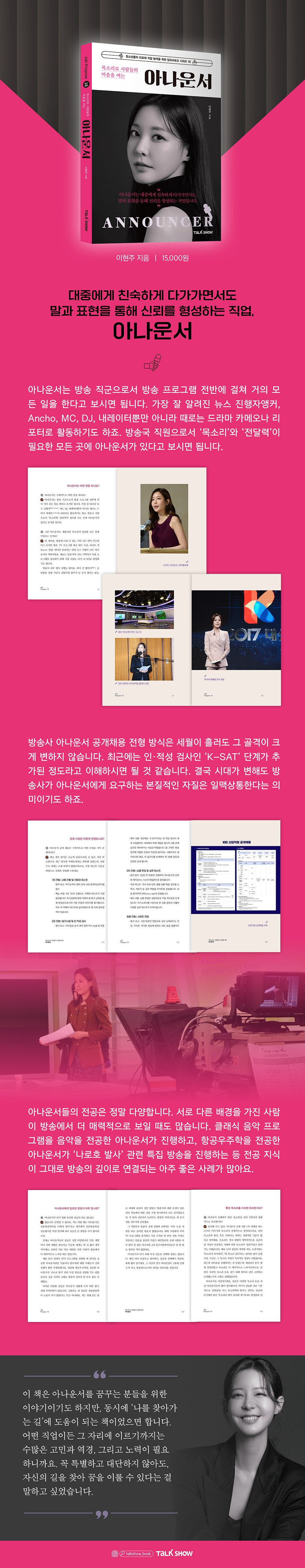 그 말이 과장이 아닐 정도로, 아나운서는 본인의 의지와 상관없이 아주 어려운 환경에 처한 분들을 만나기도 하고, 국가적인 행사가 있을 때는 사회적으로 높은 위치에 있는 분들과 대담을 나누기도 합니다. 대부분의 직업은 자신과 비슷한 환경, 비슷한 수준의 사람들을 주로 만나게 되는데, 아나운서는 그 범위가 정말 넓어요. 어린아이부터 노약자까지, 다양한 세대와 다양한 삶을 살아온 사람들을 만날 수 있습니다. 그런 경험들이 차곡차곡 쌓이면서 제 시야도 많이 넓어졌어요. 이 일을 하면서 내 인생이 조금씩 넓어지고, 또 깊어지고 있다는 느낌을 자주 받습니다.“