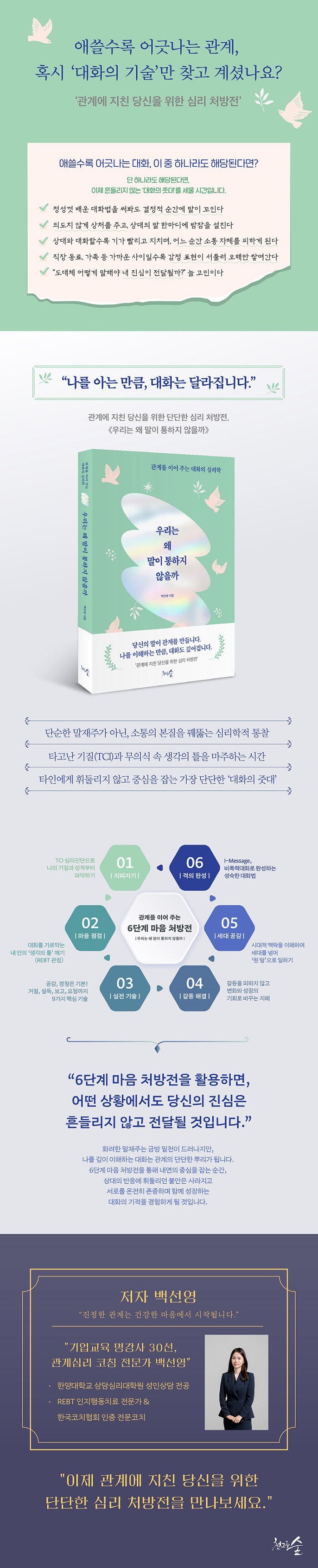 나를 이해하는 순간, 대화는 기술이 아니라 관계의 힘이 됩니다.우리는 소통의 부재가 만연한 시대를 살고 있습니다. 직장 내 세대 갈등, 협업 과정에서의 오해, 가까운 이들과의 서툰 감정 표현까지…. 관계를 위해 노력할수록 오히려 지쳐가는 우리에게 필요한 것은 더 화려한 말재주가 아니라, 소통의 본질을 꿰뚫는 심리학적 통찰입니다. 《우리는 왜 말이 통하지 않을까》는 현장에서 수많은 기업 강연과 관계심리 코칭을 이어온 저자가 깨달은 ‘관계의 힘’을 담고 있습니다. 이 책은 총 6개의 파트를 통해 나를 이해하고 상대를 수용하는 성숙한 소통의 여정을 안내합니다.