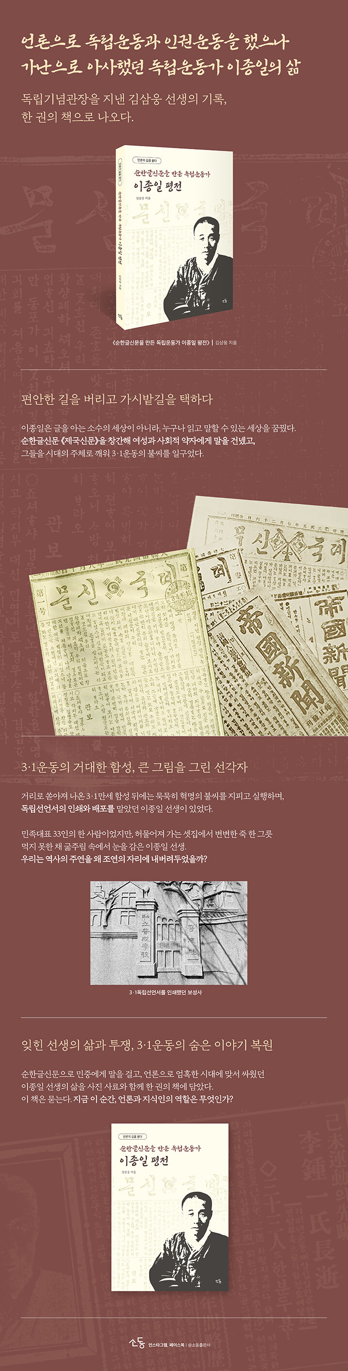 이번에 출간된 《언론의 길을 묻다 | 순한글신문을 만든 독립운동가 이종일 평전》은 이제껏 묻혀 있던 그의 삶을 따라가며 3·1혁명의 이면과 독립운동의 또 다른 축이었던 ‘언론의 길’을 본격적으로 조명한다.