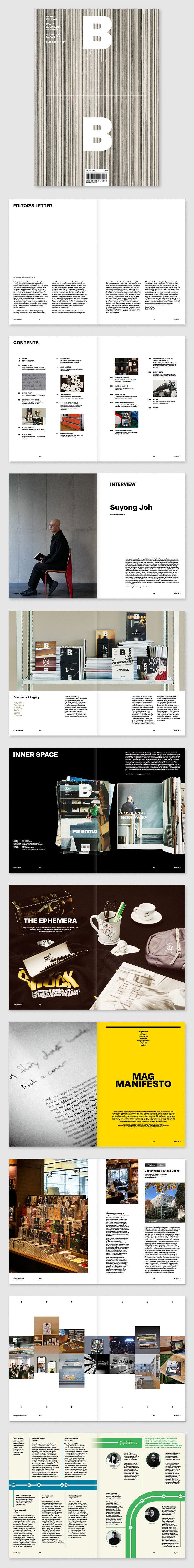 Magazine B, founded in Seoul, South Korea, in 2011 by Suyong Joh, is a documentary magazine featuring well-balanced brands that are selected based on four criteria: philosophy, price, aesthetic, and practicality. In an era when most magazines push breaking news and hot trends, B offers something fresh: a regularly published series in book form that examines brands as subjects with unique narratives and structures. Running ad-free from issue 1 to 100, the magazine has been praised for upholding the pursuit of objectivity and maintaining its independent perspective. Seen in the global creative scene as a brand guide and valuable collectible, B is expanding its experiential touchpoints with podcasts, video content, and physical stores, gearing up for its next chapter as a media brand that presents a full spectrum of brand content.