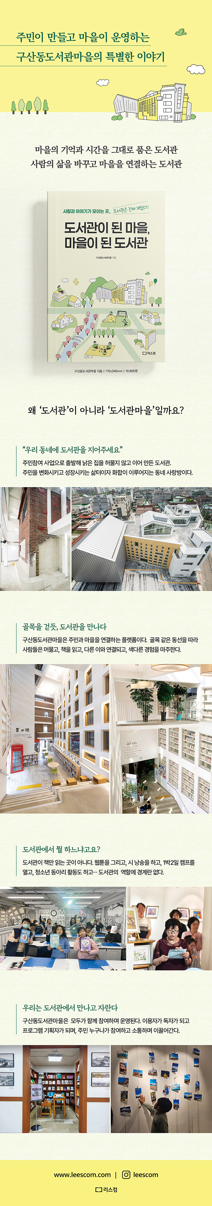 서울 은평구 구산동에 자리한 특별한 공공도서관의 이야기다. 구산동도서관마을은 새로 지은 건물이 아니라 오래된 주택 여러 채를 이어 만든 공간으로, 마을의 기억과 시간을 그대로 품고 있다. 2006년 주민들의 자발적인 서명에서 출발해 2015년 개관에 이르기까지, 이곳은 주민참여와 협동조합 운영이라는 독특한 방식으로 완성되었다.이 책은 구산동도서관마을이 만들어진 과정뿐 아니라 도서관을 이용하며 살아가는 사람의 이야기, 그리고 도서관이 마을과 관계 맺는 방식을 보여준다. 이용자가 운영자가 되고 참여가 배움으로 이어지는 이곳은 단순한 도서관을 넘어 함께 성장하는 공동체의 모델을 제시한다. 도서관이 어떻게 사람의 삶을 바꾸고 마을을 연결하는지, 그 생생한 현장을 전하는 기록이다.