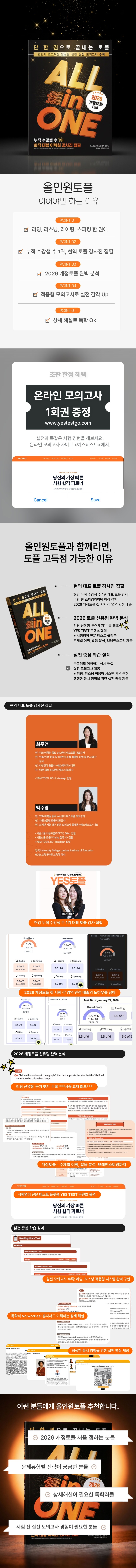 2026 개정 토플에 맞춰 Reading, Listening, Speaking, Writing 4개 영역을 단 한 권으로 완성할 수 있도록 설계된 통합 전략서이다. 10년 이상 토플을 강의해온 YES TOEFL 강사진이 각 영역별 핵심 전략과 문제 해결 방식을 정리했다.