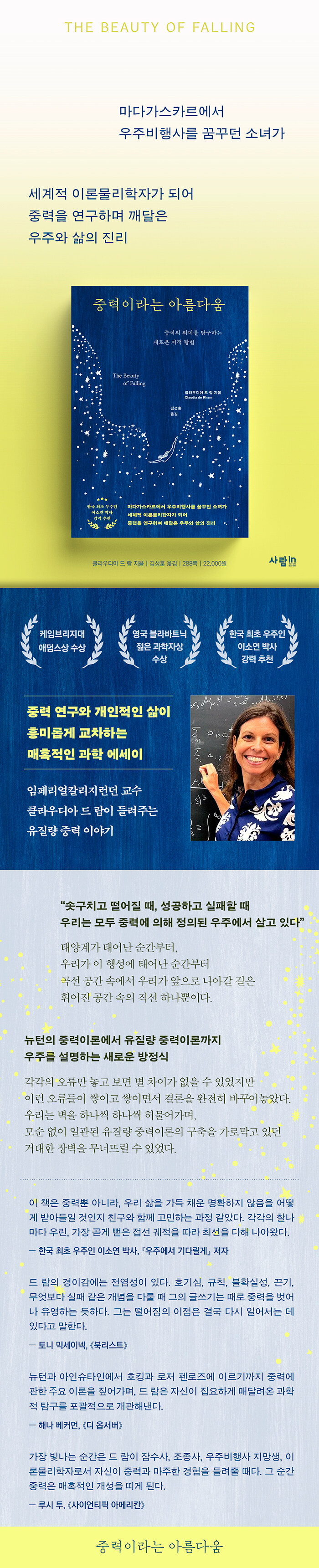 마다가스카르에서 우주비행사를 꿈꾸던 소녀가 세계적 이론물리학자가 되기까지, 저자의 삶과 중력 연구가 겹쳐지는 이야기를 읽다 보면 시간과 공간을 따라가는 여정이 결코 단순하지 않음을 깨닫게 된다. 가는 길에는 장애물도 있고 낭떠러지도 있다. 앞으로 나가기 위해서는 이러한 떨어짐을 받아들이고 그 안에서 아름다움을 발견할 수 있는 태도가 필요하다. 떨어지는 삶은 아름답다.
