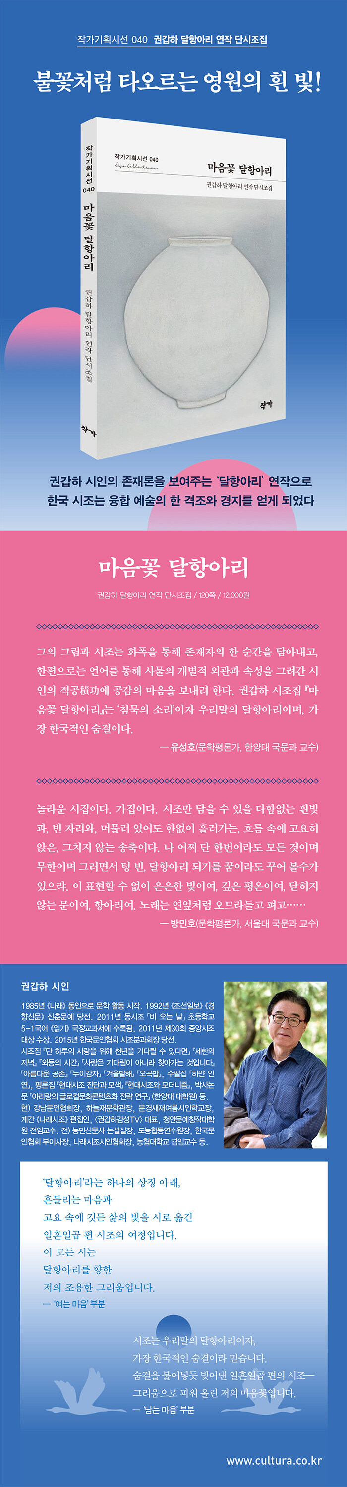 한국 시조시단의 중진 권갑하 시인의 연작 단시조집 『마음꽃 달항아리』가 작가 기획시선 40번으로 출간되었다. 이번 시조집 『마음꽃 달항아리』는 시조만이 담을 수 있는 율격적 배려가 눈에 띄는 가집으로, 총 5부로 구성되어 93편의 시편을 담고 있다.