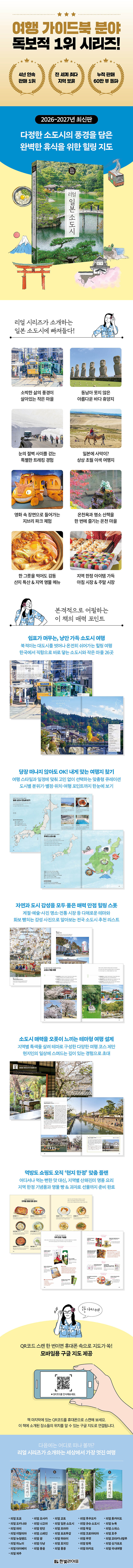 도쿄나 오사카 등 대도시 여행에 지친 사람, 도심의 일상에서 벗어나 조금은 특별한 여행을 계획하는 여행자라면 이 책이 제격이다. <리얼 일본 소도시>에서는 진정한 휴식과 잊지 못할 추억을 선사할 소도시와 여행지 20여 곳을 총망라해 선보인다. 도심에서 조금만 벗어나면 만날 수 있는 절경부터 산해진미 가득한 바다 마을, 나룻배 떠다니는 운하 마을, 동남아 뺨치는 해안 휴양 도시, 작은 교토라 불릴 만큼 고즈넉한 거리와 일본인의 삶이 녹아있는 전통 시장 등 자연과 여유로운 도시의 면모를 모두 갖춘 다채로운 여행지를 한 권에 담아냈다. 특히 시즈오카, 토야마, 나고야, 타카마츠, 마츠야마, 히로시마, 쿠마모토, 키타큐슈, 나가사키, 미야자키 등 한국에서 직항으로 갈 수 있는 도시도 다수 포함해 짧은 여행을 즐기려는 사람에게도 매우 좋다. 저자가 수년간 직접 발로 뛰며 쌓아 올린 깊이 있는 정보는 현지인의 삶 속으로 스며들듯 소도시의 진면목을 볼 수 있도록 돕는다. 책 앞머리에서 전체 여행지를 둘러보고, 도시별로 지역 특색을 살린 테마 여행 정보를 통해 보다 자세히 살펴볼 수 있다. 화보같이 아름다운 사진과 일러스트로 구성된 책장을 넘기다 보면 여행의 풍경이 머릿속에 그려지고, 없던 여행 욕구도 마구 치솟는 마법을 경험하게 된다. 다음 일본 여행은 <리얼 일본 소도시>와 함께 한적한 작은 마을에서, 오랜 여운이 남는 감성 가득한 경험을 해 보면 어떨까.
