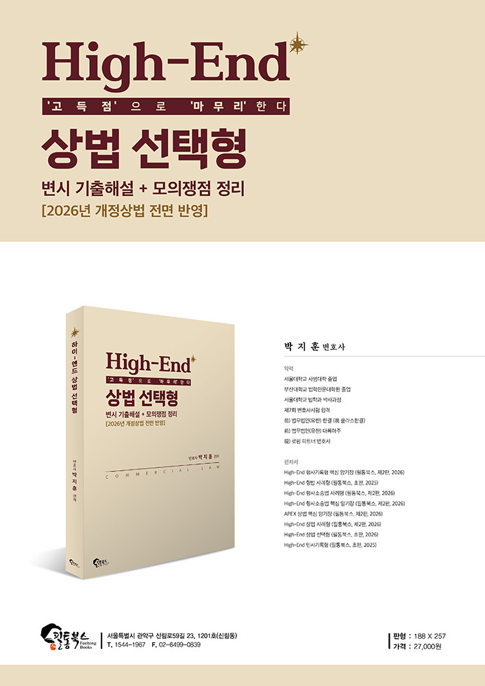 [약력]- 서울대학교 사범대학 졸업- 부산대학교 법학전문대학원 졸업- 서울대학교 법학과 박사과정- 제7회 변호사시험 합격- 前) 법무법인(유한) 한결 (現 클라스한결)- 前) 법무법인(유한) 대륙아주- 現) 로펌 파트너 변호사[편저서]High-End 형사기록형 핵심 암기장 (필통북스, 제2판, 2026)High-End 형법 사례형 (필통북스, 초판, 2025)High-End 형사소송법 사례형 (필통북스, 제2판, 2026)High-End 형사소송법 핵심 암기장 (필통북스, 제2판, 2026)APEX 상법 핵심 암기장 (필통북스, 제2판, 2026)High-End 상법 사례형 (필통북스, 제2판, 2026)High-End 상법 선택형 (필통북스, 초판, 2026)High-End 민사기록형 (필통북스, 초판, 2025)