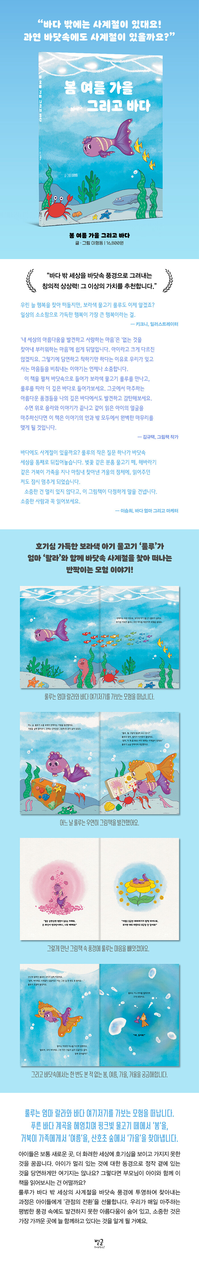 호기심 가득한 보라색 아기 물고기 룰루가 엄마 랄라와 함께 바닷속 사계절을 찾아 떠나는 반짝이는 모험 이야기 『봄 여름 가을 그리고 바다』다. 우연히 발견한 그림책 속 풍경에 마음을 빼앗긴 룰루는 바닷속에서는 한 번도 본 적 없는 봄, 여름, 가을, 겨울을 궁금해한다.