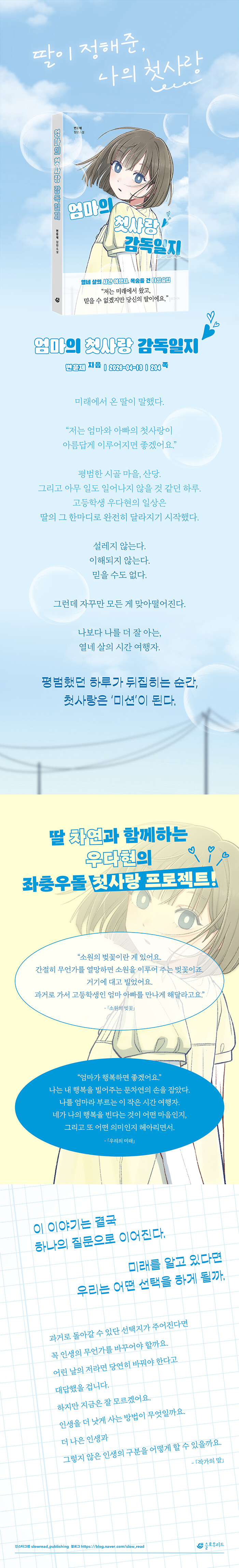 『엄마의 첫사랑 감독일지』는 시간 여행이라는 장르적 장치를 바탕으로, 첫사랑의 설렘, 친구와의 갈등, 선택의 무게까지 청소년기의 다양한 얼굴을 담아낸다. 첫사랑을 넘어, ‘그때의 선택’이 남긴 고민과 공감을 선사하는 특별한 성장 소설로, 우리에게 깊은 여운을 남긴다.