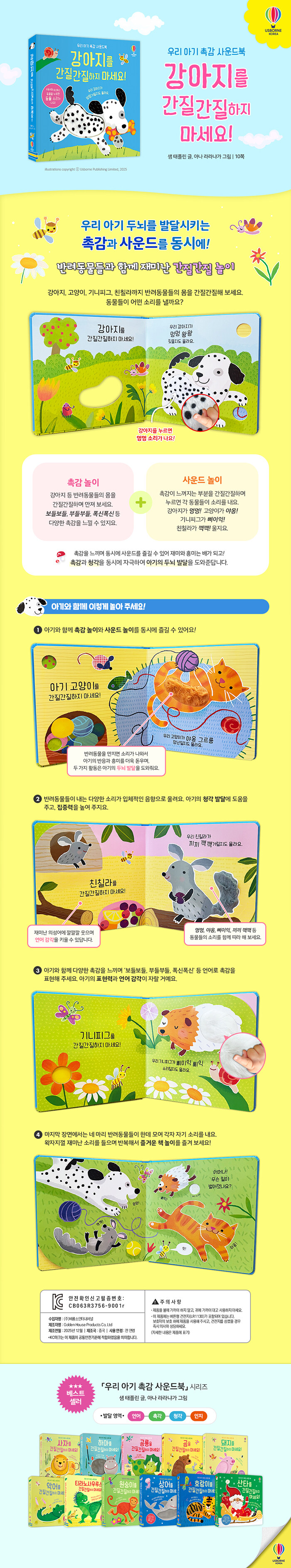 ◆ 아기와 함께 이렇게 놀아 주세요!○ 아기와 함께 촉감 놀이와 사운드 놀이를 동시에 즐길 수 있어요! 반려동물을 만지고 누르면 소리가 나와서 아기의 반응과 흥미를 더욱 돋우며, 두 가지 활동은 아기의 두뇌 발달을 도와줘요.