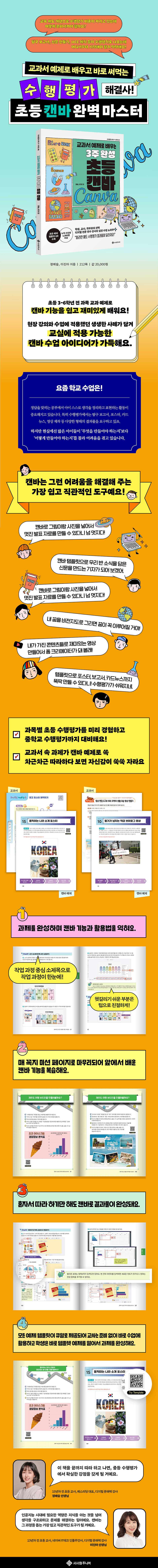 특히 초등 3~6학년 전 과목 교과 과제를 바탕으로 구성한 21개의 예제를 통해, 배운 내용을 바로 결과물로 연결할 수 있다는 점이 이 책의 가장 큰 특징이다. 모든 예제는 QR 코드로 제공되어 교사는 수업에 바로 활용할 수 있고, 학생은 템플릿을 열어 쉽게 과제를 완성할 수 있다.