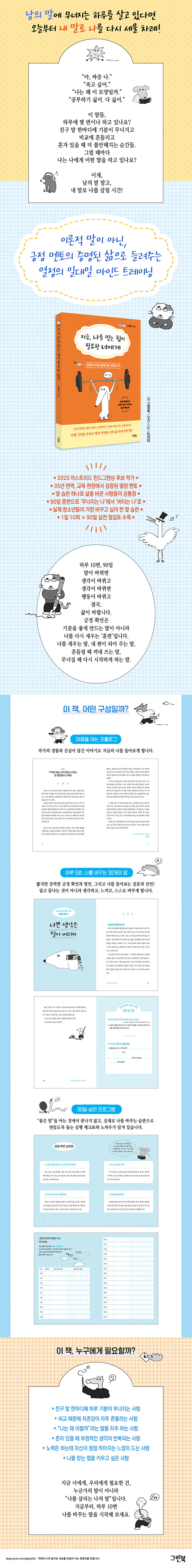 풍부한 가이드와 체크표 수록남의 말은 듣고 읽고 감상하면 되지만, 나의 말은 내 삶에 적용할 때 그 힘이 더욱 발휘된다. 《지금, 나를 믿는 힘이 필요한 너에게》는 도서 곳곳에서 독자들이 스스로 자신의 생각을 점검하고, 쓰고, 말하도록 돕는다. 책의 앞부분에 있는 작가의 ‘서문’과 ‘긍정 확언 실천법’은 ‘긍정 확언’이라는 용어가 낯선 독자들에게 긍정적인 말로 일상을 단단하고 생기 있게 만들 수 있는 방법을 친절하게 안내해 준다.