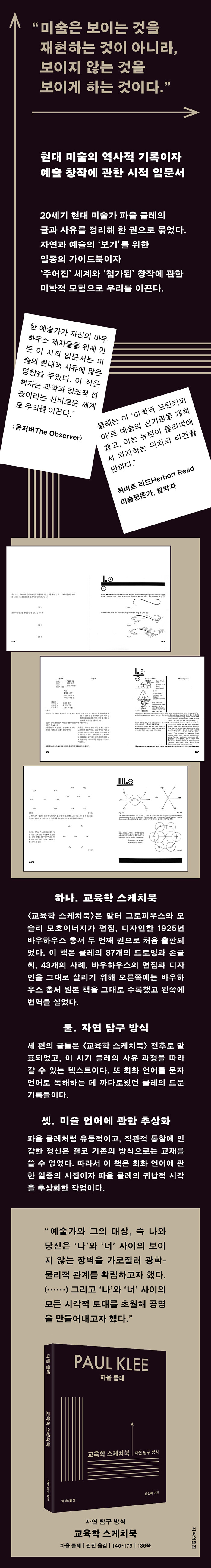 이 책의 1부는 클레의 바우하우스 ‘형태론’ 강의를 편집해 재구성한 《교육학 스케치북》을 수록했고, 2부는 클레의 미술에 관한 저술 세 편을 실었다. 《교육학 스케치북》은 발터 그로피우스와 모슬리 모호이너지가 편집, 디자인한 1925년 바우하우스 총서 두 번째 권으로 처음 출판되었다. 이 책은 클레의 87개의 드로잉과 손글씨, 43개의 사례, 바우하우스의 편집과 디자인을 최대한 살리기 위해 오른쪽에는 바우하우스 총서 원본 책을 그대로 수록했고 왼쪽에 번역을 실었다. 오른쪽의 그림 속 손글씨 번역은 왼쪽 그 위치에서 찾아볼 수 있다. 2부 세 편의 글은 《교육학 스케치북》 전후로 발표되었고, 이 시기 클레의 사유 과정을 따라갈 수 있는 텍스트이다. 또 회화 언어를 문자 언어로 독해하는 데 까다로웠던 클레의 드문 기록들이다.