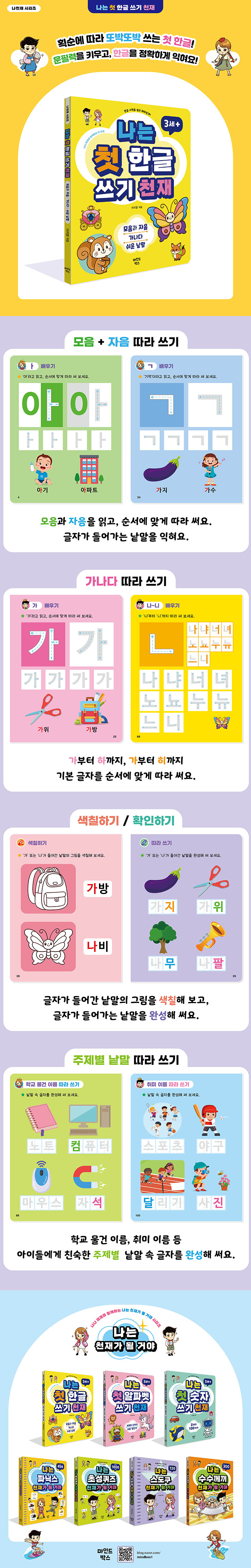 한글 시작을 쉽고 재미있게. 획순에 따라 또박또박 쓰는 첫 한글. 운필력을 키우고, 한글을 정확하게 익힌다. 모음과 자음을 읽고, 순서에 맞게 따라 쓴다. 글자가 들어가는 낱말을 함께 익힌다. '가'부터 '하'까지, '가'부터 '히'까지 익힌다. 기본 글자를 순서에 맞게 따라 쓴다. 글자가 들어간 낱말의 그림을 색칠한다. 글자가 들어가는 낱말을 완성해 쓰면서 복습한다. 가족 호칭, 우리 집 물건, 학교 물건, 취미, 음식 이름 등 아이들에게 친숙한 주제별 낱말 속 글자를 완성해 쓴다.