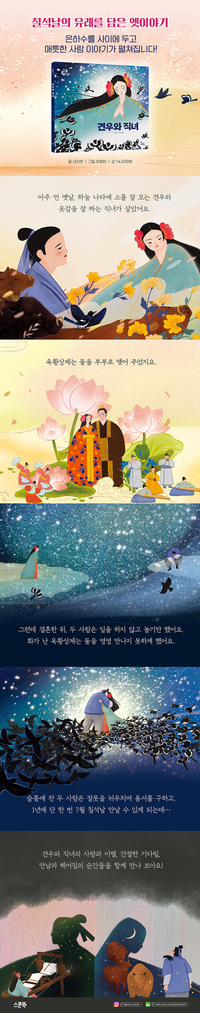 우리 조상들이 밤하늘의 별을 보며 상상했던 낭만적인 옛이야기를 바탕으로, 사랑과 이별, 그리고 간절한 기다림 끝에 얻은 재회의 기쁨을 아이들의 눈높이에 맞춰 흥미진진하게 풀어냈다. 칠석날 내리는 비가 왜 두 사람의 눈물인지, 왜 이 시기에 까마귀와 까치를 보기 힘든지 등 전통문화의 정서를 자연스럽게 배울 수 있다.
