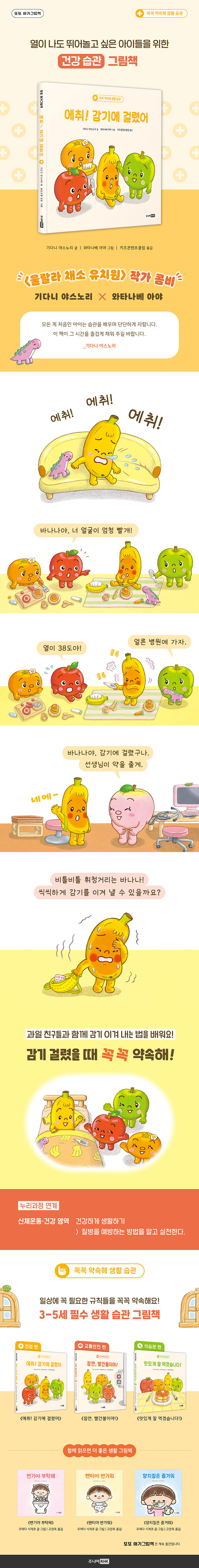 이 시리즈에서 소개하는 《에취! 감기에 걸렸어》는 감기를 씩씩하게 이겨 내는 과정을 그린다. 열이 펄펄 나도 친구들과 놀고 싶어 하는 바나나의 모습은 우리 아이들의 천진난만한 일상을 그대로 옮겨 놓은 듯 생생하다. 과일 친구들이 바나나에게 건네는 다정한 응원을 통해, 약을 먹고 푹 쉬는 일이 건강을 지키는 가장 좋은 방법임을 전한다.