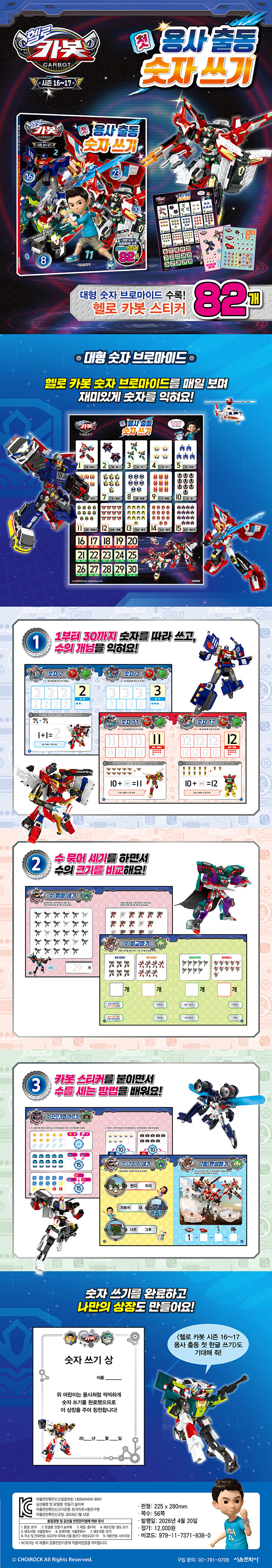 용감하고 정의로운 용사 카봇 출동! 헬로 카봇 시즌 16~17에 등장하는 카봇 친구들과 함께 숫자를 따라 쓴다. 1부터 30까지 숫자를 따라 쓰며 ‘1 큰 수’의 개념을 익히고, 수를 10단위로 묶어 세며 수의 크기를 비교한다. 카봇 스티커를 붙이면서 수를 세는 방법도 배운다.