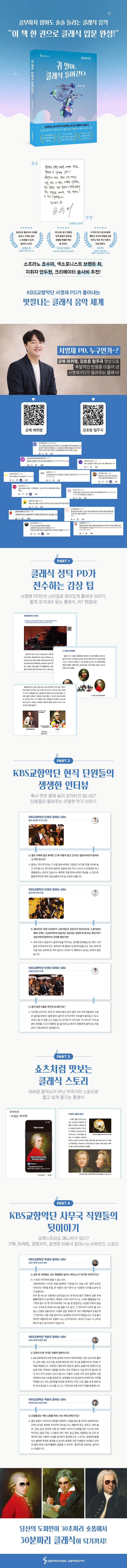 클래식 '성덕'인 서영재 PD가 전수하는 감상 팁과 더불어 KBS교향악단 현직 단원들의 생생한 인터뷰, 쇼츠처럼 맛보는 클래식 스토리, KBS교향악단 사무국 직원들의 뒷이야기까지 누구나 친근하게 클래식에 다가갈 수 있는 이야기들을 가득 담았다. 특히 독자의 이해를 돕는 풍성한 사진 자료는 물론, 텍스트만으로는 다 전할 수 없는 현장의 감동을 즉석에서 확인할 수 있도록 연주 영상 QR코드를 본문 곳곳에 배치했다. 눈으로 읽고 귀로 바로 듣는 이 입체적이고 친절한 안내서를 따라가다 보면, 클래식이라는 미지의 세계는 어느덧 당신의 가장 즐거운 놀이터가 되어 있을 것이다.