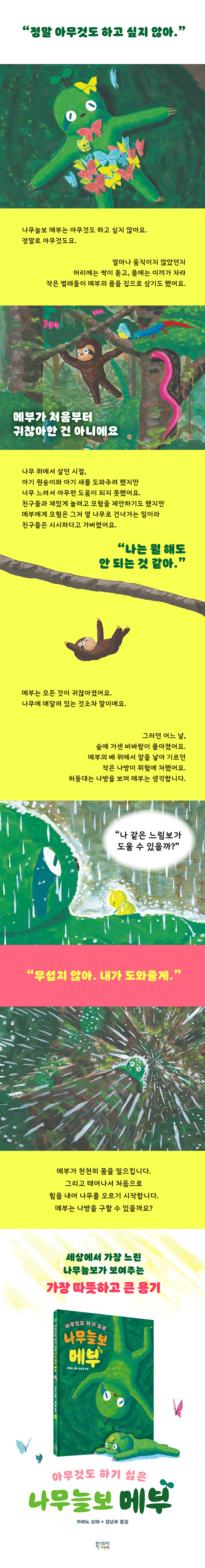 아무것도 하기 싫던 나무늘보 메부는 몸에 난 싹과 이끼를 모두 뜯어 먹고 힘을 내어 천천히 몸을 일으킨다. 그리고 오직 나방 가족을 구하고 싶다는 마음 하나로, 생애 처음 가장 힘껏 나무를 오르기 시작한다.