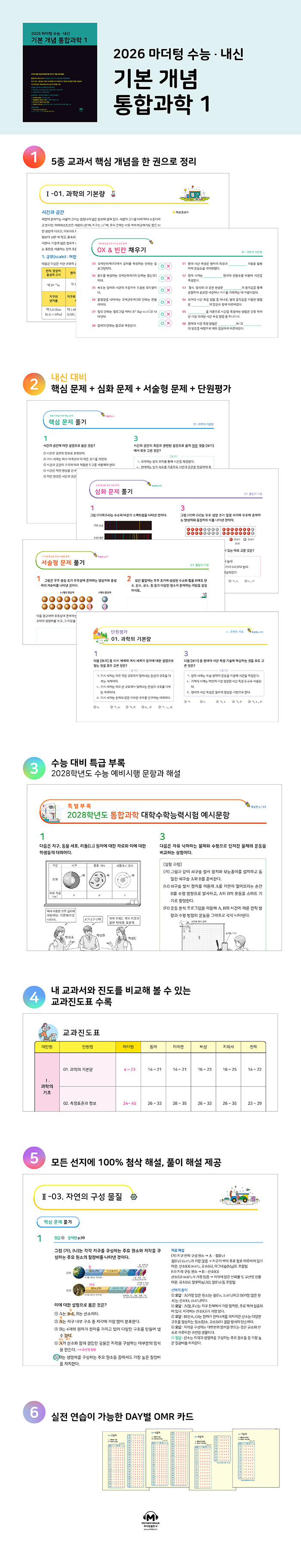 5종 교과서 개념을 한 권으로 시험 빈출 개념과 자료를 총정리했다. 내신 필수 문제 360문제, OX & 단답형 407문제, 단원평가문항 68문제와 2028학년도 대학수학능력시험 예시문항과 해설을 수록했다. 또, 단원별·난이도순 체계적인 문제 배치로 개념 확인 OX & 빈칸 문제, 핵심 문제, 심화 문제, 서술형 문제, 단원평가문항으로 구성했다. 문제편보다 두꺼운 친절하고 자세한 해설편으로 자세한 첨삭 해설과 분석적이고 철저한 오답 해설을 담았다.