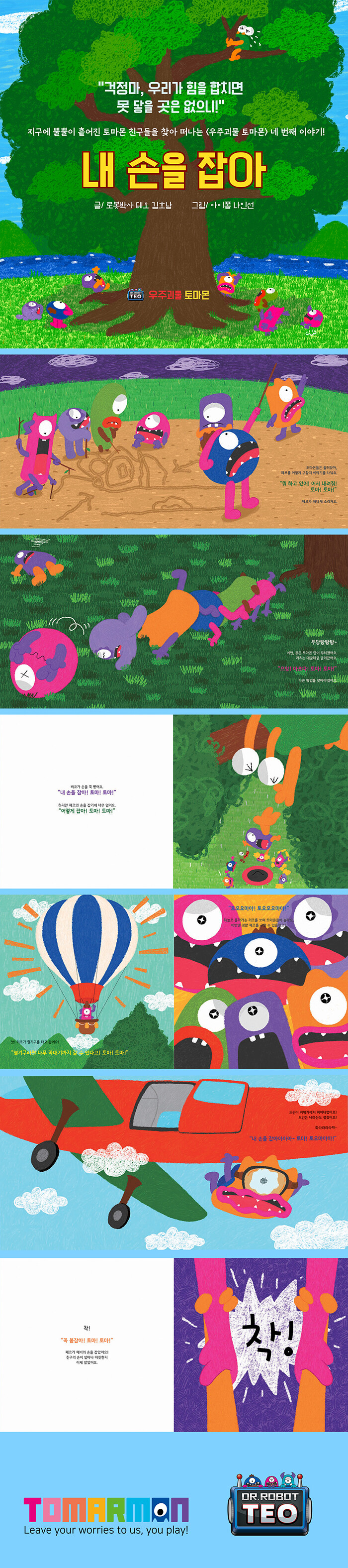 네 번째 이야기인 <내 손을 잡아>는 이미 친구를 찾은 이후부터 이야기가 전개됩니다. 친구를 찾긴 찾았지만, 드넓은 초원에 홀로 우 솟아 있는 높은 나무에 매달려 있어, 친구를 만날 수가 없습니다. 토마몬 친구들이 높은 나무에서 기다리고 있는 친구의 손을 잡기 위해 궁리하고, 서로의 아이디어를 실현하며 좌충우돌하는 모습은, 책을 보는 내내 행복한 미소를 짓게 합니다. 책을 읽으며 때로는 아이들과 더욱 기발한 생각을 부모님과 얘기하고 흉내를 내며 유쾌한 시간을 선물할 수 있기도 합니다. 우주, 우주괴물, 초원, 로봇, 동물, 패션쇼, 높은 곳에 닿기 위한 기발한 아이디어까지 갖가지 다채로운 소재로 다양한 에피소드가 소개되는 <우주괴물 토마몬> 시리즈는, 부모님과 아이들이 책을 함께 읽으며 우주에 대한 상상과 일상에서의 창의력, 이와 관련한 꿈에 대한 이야기 거리를 제공할 수 있는 흥미진진한 책이 될 것입니다.