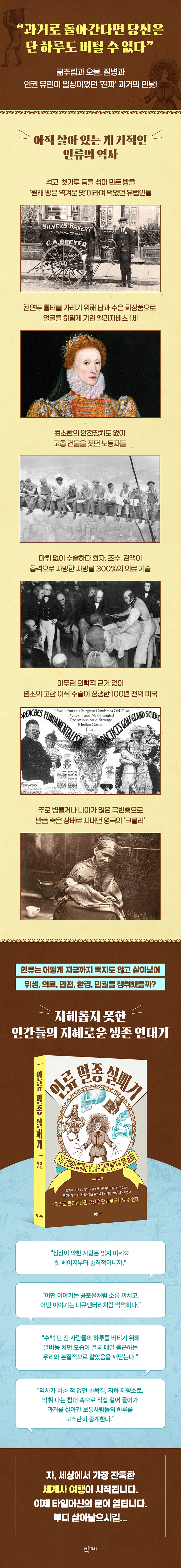 위생, 의료, 안전, 환경, 인권… 처절한 생존을 통해 비로소 쟁취한 문명의 기록!우리는 멸망 이후의 세계를 상상하는 데 익숙하다. 기후 위기, 전염병, 전쟁의 공포 속에서 현대인은 늘 ‘생존’을 이야기하지만, 역설적이게도 오늘날의 일상은 인류사 전체를 통틀어 가장 안온하고 위생적인 기적의 순간이다. 배달 앱으로 끼니를 해결하고, 깨끗한 수돗물로 샤워하며, 가벼운 통증에도 마취와 항생제의 도움을 받는 오늘날의 일상은 사실 인류가 수천 년간 마주했던 ‘멸종의 위기’를 간신히 모면한 결과물이다.