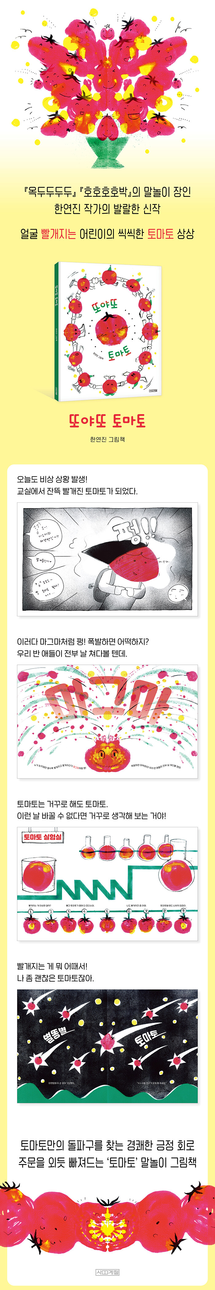 얼굴이 자꾸 빨개지는 어린이의 외침 ‘또야또 토마토’. 설레는 결심을 한 날, 반 아이들 앞에서 다시 얼굴이 달아오른 주인공은 교실을 뛰쳐나와 ‘토마토’를 되뇌며 새로운 생각의 길을 찾기 시작한다.
