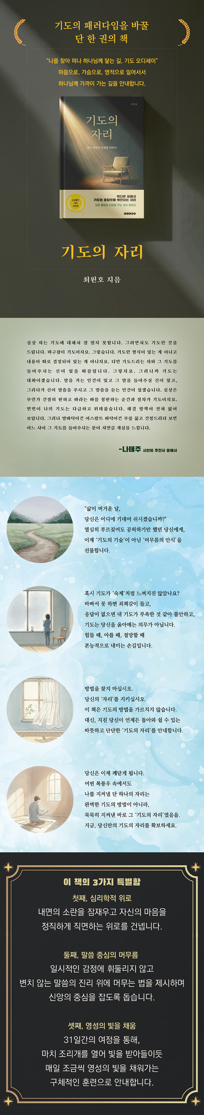 기도의 패러다임을 바꿀 단 한 권의 책. 우리는 늘 ‘어떻게’ 기도해야 하는지 묻는다. 더 유창하고 화려한 문장, 더 간절한 목소리, 더 확실한 응답을 주는 ‘방법’을 찾아 헤맨다. 하지만 성경이 말하는 기도의 본질은 방법이 아니라 ‘자리’에 있다.