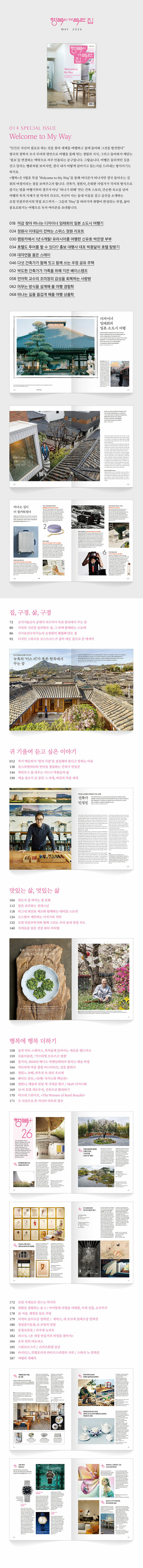 1987년에 창간된 《행복이 가득한 집》은 인테리어와 건축을 비롯해 요리와 패션, 문화와 예술에 관한 새로운 정보를 전달하며, 일상을 디자인하고 삶을 풍요롭게 만드는 방법을 제안하는 라이프스타일 잡지이다. 이 책은 《행복이 가득한 집》에 실린 ‘한옥’에 대한 칼럼을 선별해 엮은 것으로, 사는 이가 저마다의 취향과 라이프스타일에 맞추어 아름답고 실용적으로 개축 또는 신축한 한옥을 기자들이 직접 찾아다니며 취재했다. 북촌 한옥마을의 전통 한옥을 고쳐 지은 살림집부터 1만m²가 넘는 대지에 첨단 소재를 사용해 새로 지은 한옥 호텔까지 스물네 채의 집을 속속들이 구경할 수 있다.Founded in 1987, the monthly magazine <House Full of Happiness> features a lifestyle and culture topics that convey the importance of ‘house’, which is a vessel for life, and ‘family’ living in it. Focusing on interiors and architecture, it spreads new information and suggestions on cuisine, fashion, culture, and art to design and enrich everyday life. In addition to the publication of monthly magazines, it has published books that spread the joy of seeing and reading, such as “Monk Seonjae's Temple Food”, “Designing My Small House”, “Hanok, View”, “Slow Farmers,” and “Korean Food Master.”
