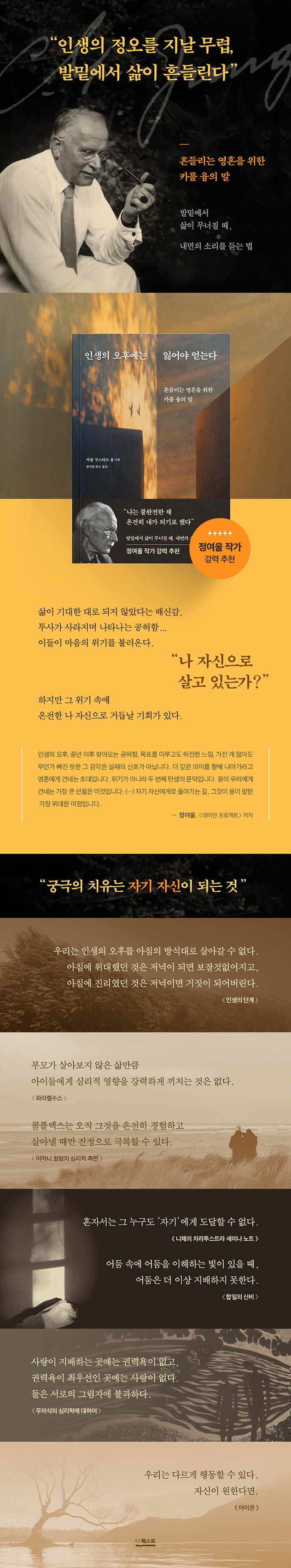 궁극의 치유는, 자기 자신이 되는 것삶이 기대한 대로 되지 않았다는 배신감, 투사가 사라지면서 나타나는 공허함. 이런 것이 우리 정신의 위기를 불러온다. 하지만 이런 위기 속에 온전한 나 자신으로 거듭날 기회가 있다. “나는 한 번이라도 나 자신으로 살아본 적이 있는가?”라는 질문을 마주하는 것은 어쩌면 일생일대의 선물이다. 또한 우리 중 누구도 예외 없이 한계와 쇠락, 나아가 유한성과 맞닥뜨릴 수밖에 없기에, ‘자기 자신이 되기’란 하나의 선택이 아니라 우리 존재의 법칙이다.