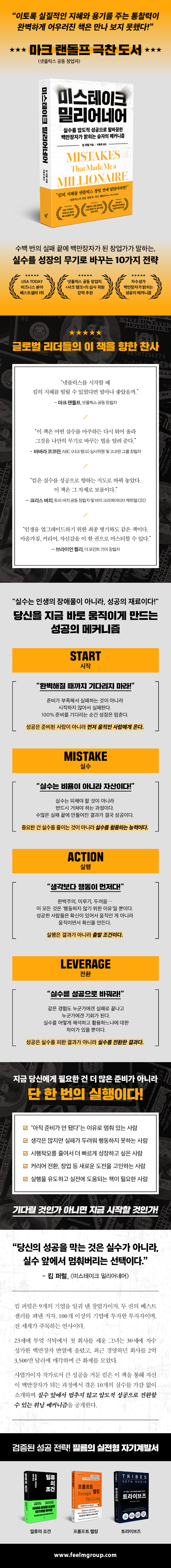 실수를 두려워하는 이들을 위한 가장 강력한 행동 지침서많은 이들이 완벽한 순간을 기다리며 시작을 미룬다. 더 나은 타이밍, 더 철저한 준비, 더 확실한 조건이 갖춰질 때까지 행동을 유예한다. 그러나 자수성가한 백만장자 기업가 킴 퍼럴은 《미스테이크 밀리어네어》에서 “완벽히 준비될 때까지 기다리는 것, 그것이 첫 번째 실수다”라고 단언한다. 저자는 파산 위기를 겪기도 했고 잇달은 사업 실패라는 극단적인 경험을 겪기도 했다. 그러면서 그는 완벽주의가 얼마나 교묘하게 실행을 가로막는지 깨달았다. 저자는 실수를 피해야 할 결함이 아니라, 기회로 전환하는 출발점으로 재정의한다.