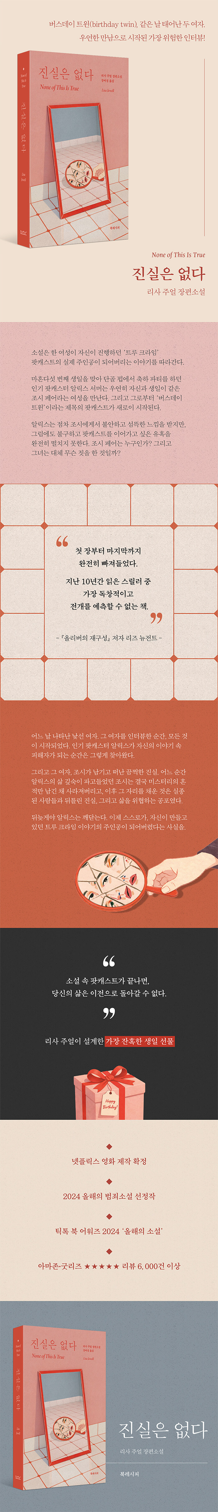 리사 주얼이 설계한 가장 잔혹한 생일 선물‘통제 성향의 주인공들, 갇힌 공간에서 벌어지는 사건들, 기괴한 실종과 참혹한 살인, 그리고 충격적 결말.’ 미국 매체 《USA 투데이》는 리사 주얼의 작품들을 이렇게 요약했다. 리사 주얼을 아직 잘 알지 못하는 독자들이라 하더라도 이 한 문장만으로 그녀가 어둡고 매혹적인 스릴러를 써내는 작가임을 충분히 짐작할 수 있을 것이다. 예상을 뒤엎는 반전으로 열혈 팬층을 거느린 작가이기도 하다. 『진실은 없다』 역시 예외가 아니다. 인기 팟캐스터 알릭스 서머와 우연한 만남을 가장해 그녀에게 접근한 조시 페어 그리고 계속되는 불안과 의심의 흔적들. 조시는 평범해 보이던 첫인상과 달리 점점 불편하고 충격적인 이야기들을 털어놓으며 급기야 알릭스의 삶을 조금씩 침범하기에 이른다. 진실을 알고 싶은 욕망과 후회 사이에서 갈등하던 알릭스는 결국 갑작스러운 실종 사건에 휘말리게 되는데…….