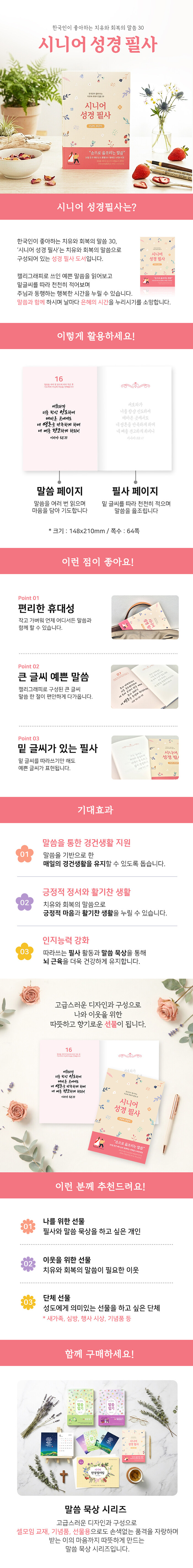 시니어 성경필사_한국인이 좋아하는 치유와 회복의 말씀은 30절의 치유와 회복의 말씀으로 구성되어 있는 성경 필사 도서입니다. 캘리그래피로 쓰인 예쁜 말씀을 읽어보고 밑글씨를 따라 천천히 적어보며 주님과 동행하는 행복한 시간을 누릴 수 있습니다. 말씀과 함께 하시며 날마다 은혜의 시간을 누리시기를 소망합니다.