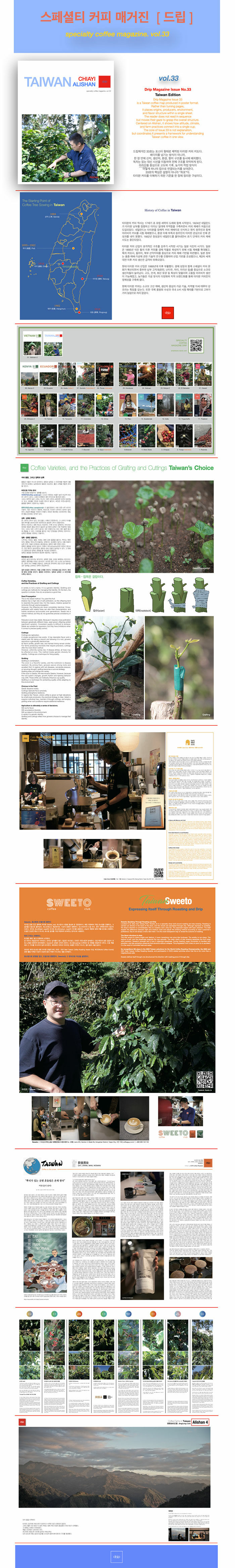드립매거진 33호는 타이완 커피를 하나의 구조로 읽어내기 위해 기획된 포스터형 매거진이다. 이번 호는 기존의 기사 중심 편집에서 벗어나, 한 장의 지면 안에 산지와 환경, 생산자, 그리고 향미의 흐름을 동시에 담아내는 방식으로 구성되었다.
