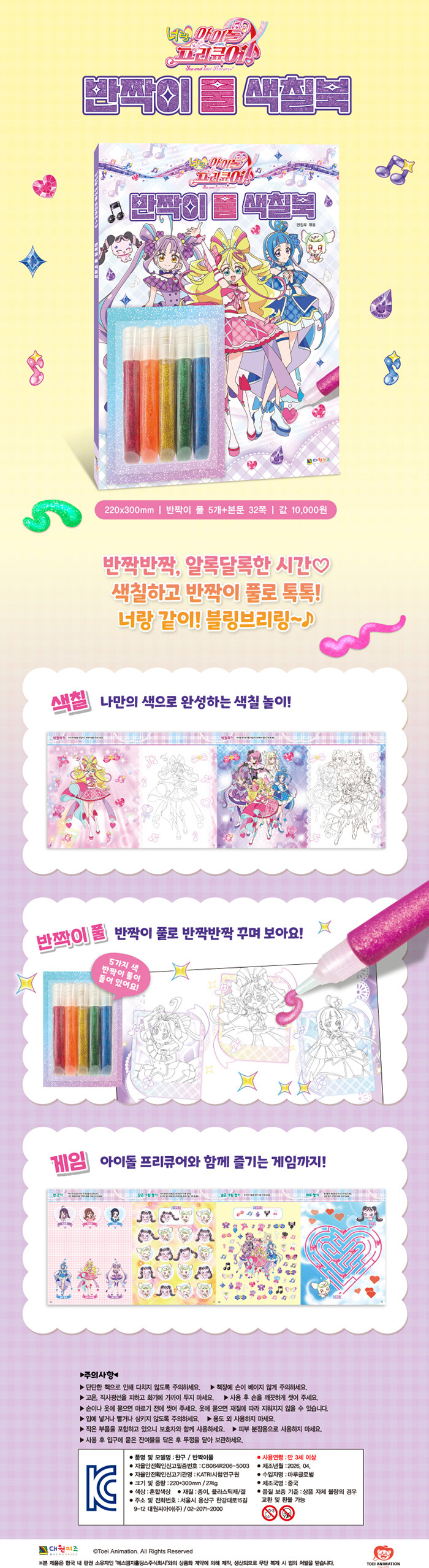 인기 애니메이션 <너랑 아이돌 프리큐어♪>가 반짝이 풀 색칠북으로 찾아왔습니다. 국내에서는 JEI 재능TV를 통해 방영되어 여아 시청률 상위권을 기록한 화제작으로, 큐어 콩콩, 큐어 아이돌, 큐어 윙크, 큐어 키스, 큐어 심쿵 다섯 명의 아이돌 프리큐어를 아이들이 직접 색칠하고 꾸밀 수 있습니다. 색연필이나 크레파스로 자유롭게 색칠한 뒤, 반짝이 풀로 의상과 무대를 톡톡 꾸며 주면 진짜 아이돌 무대처럼 화려하게 완성! 단순한 색칠 놀이를 넘어 소근육 발달과 색채 감각, 창의력까지 자연스럽게 키울 수 있습니다. 애니메이션 속 캐릭터와 무대를 내 손으로 직접 완성하는 특별한 경험을 선물해 주세요.