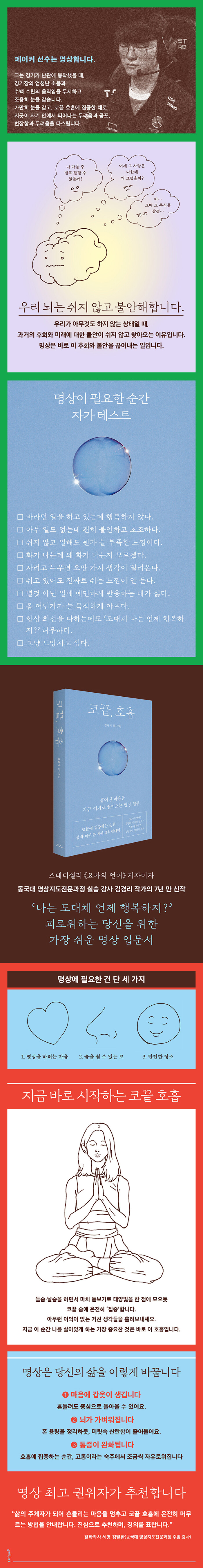 동국대 명상지도전문과정 혜명 김말환이 추천하는 호흡 명상의 정수리그오브레전드 월드 챔피언십 6회 우승. e스포츠 역사에 전무후무한 기록을 새긴 페이커(이상혁) 선수에게는 경기 전 루틴이 있다. 경기 시작 직전, 그는 어떤 소음과 소동에도 신경 쓰지 않고 조용히 눈을 감고 명상한다. e스포츠 중계 장면이라고는 믿기지 않을 정도로 고요한 이 모습에, 중계하던 중국의 해설자가 “무서워요. 정말 무섭습니다.”라는 속마음을 내뱉은 것이 밈처럼 퍼지기도 했다. 뇌 반응이 가장 빠른 10대 후반~20대 초반에 전성기를 맞는 e스포츠 세계에서, 20대 후반의 나이에도 우승을 거머쥔 페이커의 비결은 자타공인 ‘강력한 멘탈’이다. 그리고 그의 강력한 멘탈의 비결은 ‘명상혁’이라는 그의 별명이 말해준다.