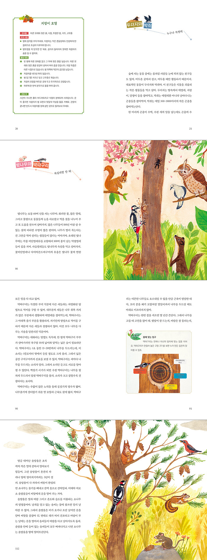 세상 모든 것들은 존재 의미가 있어요숲의 이야기를 따라가다 보면 작은 것 하나도 소중히 여겨야 하는 이유 역시 배우게 됩니다. 비 오는 날이면 꿈틀대며 밖으로 나오는 지렁이는 숲의 흙이 늘 촉촉하게 유지되도록 하는 고마운 친구이고, 나뭇잎을 갉아먹는 애벌레는 어린 새들의 소중한 영양분이에요. 끝없이 나무를 쪼아 대어 나무를 병들게 한다고 의심받는 딱따구리는 수많은 동물들의 보금자리를 만들어 주는 소중한 존재죠.