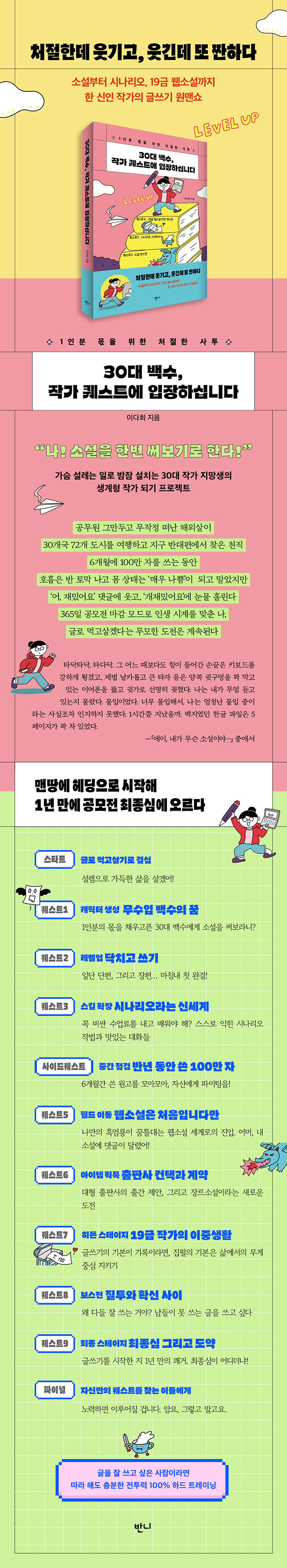 작가가 집필로 밤낮없이 바쁜 와중에 이 책을 세상에 내놓는 이유는 단 하나다. 꿈을 찾지 못해 방황하고 갈등하는 동시대의 동료들에게 ‘우리 함께 해봅시다’라는 메시지를 선사하고픈 마음이 간절해서다. 『30대 백수, 작가 퀘스트에 입장하십니다』는 매일의 성실함과 노력이 단지 무모한 것만은 아니라는 믿음이 공유되기를 바라는 마음이 담긴 책이다.