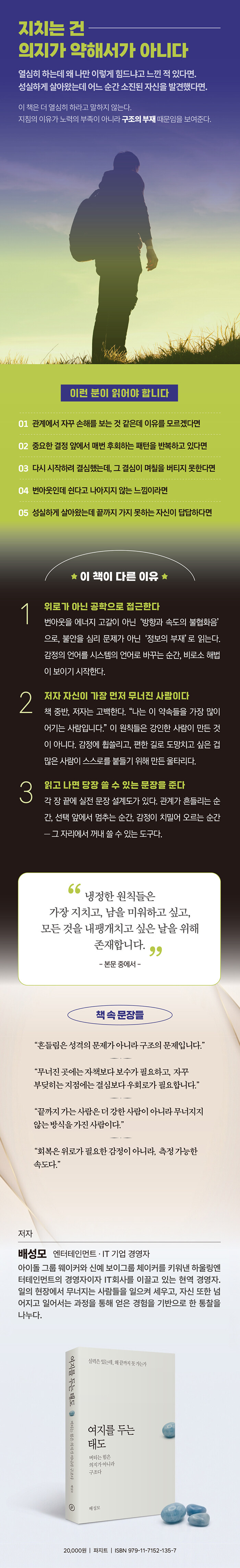 엔터테인먼트 회사와 IT회사의 경영자이다. 두 조직을 이끌며 지금도 현장을 직접 뛰는 사람이다.오랫동안 사람과 조직이 무너지는 장면을 가까이에서 보아왔다. 버티는 사람보다 먼저 지치는 사람, 성실함에도 불구하고 끝까지 가지 못하는 사람, 의지만으로 버티다 끝내 스스로를 소진시키는 사람들을 반복해서 마주했다. 그 경험이 하나의 결론으로 이끌었다. 사람을 오래 지켜주는 것은 의지가 아니라 구조라는 것.함부로 사람을 단정하지 않는다. 감정에 휩쓸려 성급히 결론 내리기보다, 한 걸음 물러서서 상황을 보고 기준을 세우는 쪽을 택한다. 거창한 결심보다 작고 짧게 시작하는 방식을 믿으며, 무작정 버티기보다 감당할 수 있는 범위를 설정하고 지속 가능한 리듬과 장치를 설계하는 일에 오랫동안 관심을 두어왔다.왜 성실한 사람이 먼저 무너지는지, 무엇이 삶을 소진으로 몰아가는지, 그리고 흔들리는 순간에도 자신을 지킬 수 있는 구조를 어떻게 세울지. 그 질문들을 오래 붙들고 살펴온 끝에, 그 태도를 단 두 글자로 정리한다. 여지.