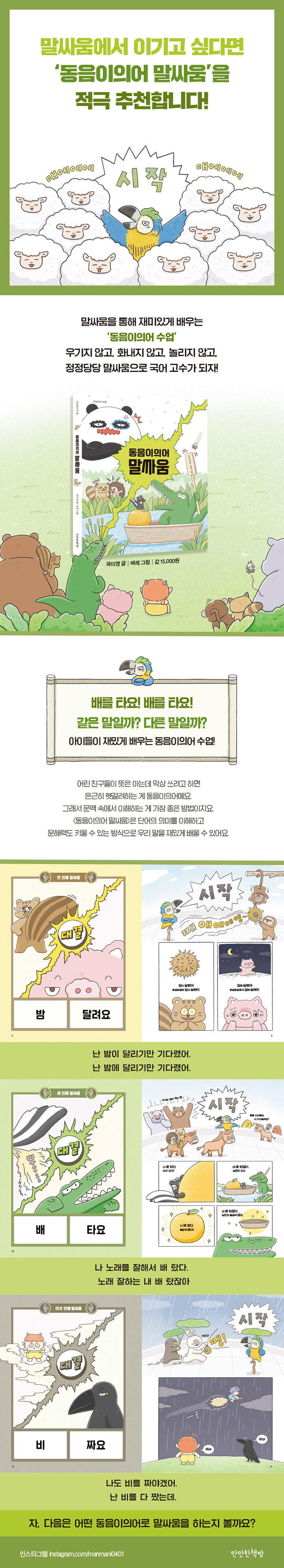 ❚우기지 않고, 화내지 않고, 대화의 기술을 키우다!보통 ‘말싸움’이라고 하면 상대방을 윽박지르거나 나쁜 말을 하거나 감정적으로 비방하는 부정적인 상황을 떠올리기 쉽다. 이 책은 그 지점을 영리하게 뒤틀어 대결이라는 방식으로 탈바꿈한다. 상대의 말을 따라 하거나 윽박지르거나 나쁜 말을 하면 대결에서 지는 규칙을 통해 아이들은 화를 내기보다 상황에 맞는 적절한 단어를 떠올리려고 노력하고 논리적으로 대응하는 ‘진짜 말싸움의 기술’을 배운다. 결국 이 책에서 벌어지는 숲속 동물들의 말싸움은 단순한 언어 학습이 아니라, 상대를 존중하면서도 기발하게 말싸움을 거는 ‘언어 놀이’가 된다. 우리 말은 이 같은 언어 놀이를 즐길 수 있는 최고의 무기가 되는 셈이다.