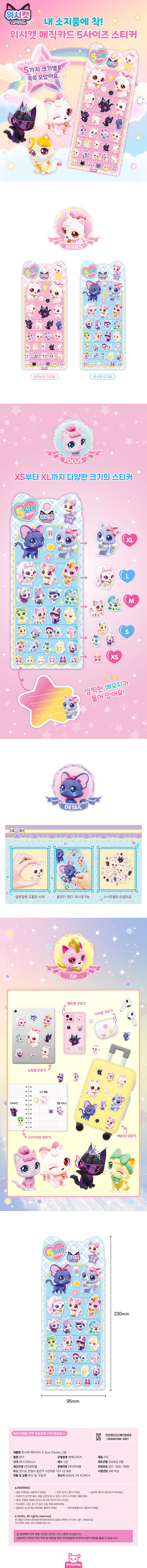 - 스티커 : 투명한 젤리 느낌의 위시캣 스티커를 만나보세요. 붙였다 뗐다 재사용이 가능하며 XS부터 XL까지 5가지 크기별로 귀엽고 깜찍한 그림을 모았어요. 내 소지품에 위시캣 친구들을 붙여보세요.