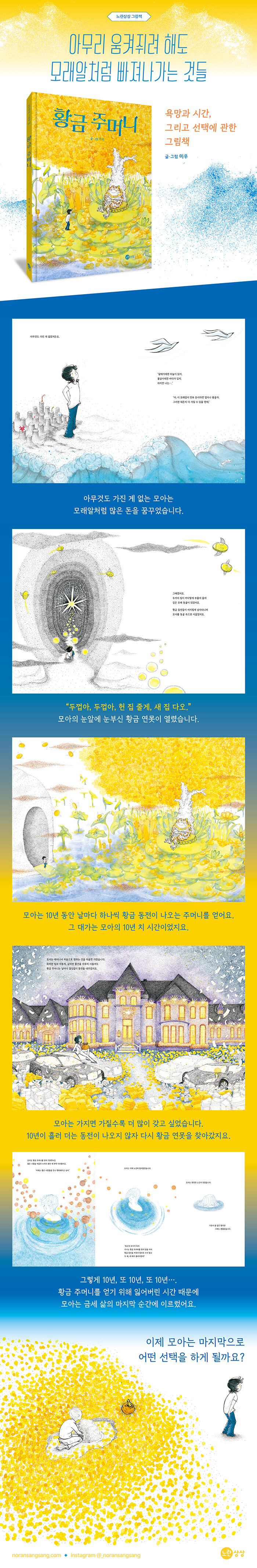 돈과 시간, 그 사이에서 우리의 선택은?홀로 바닷가에 서서 하늘과 바다를 하염없이 바라보는 소년이 있어요. ‘아무것도 가진 게 없어서 가지고 싶은 게 참 많은’ 모아는 눈앞의 모래알처럼 돈이 많다면 얼마나 좋을까 하고 생각합니다. 그 마음이 통했을까요. 모래집을 만들며 “두껍아, 두껍아, 헌 집 줄게, 새 집 다오.” 노래하던 모아의 눈앞에 눈부신 황금 연못 세상이 열립니다. 연못의 주인인 황금 두꺼비는 10년 동안 날마다 황금 동전을 꺼내 쓸 수 있는 주머니를 내어주는 대신 무서운 대가를 요구하지요. 바로 모아의 10년 치 시간, 즉 생명입니다.