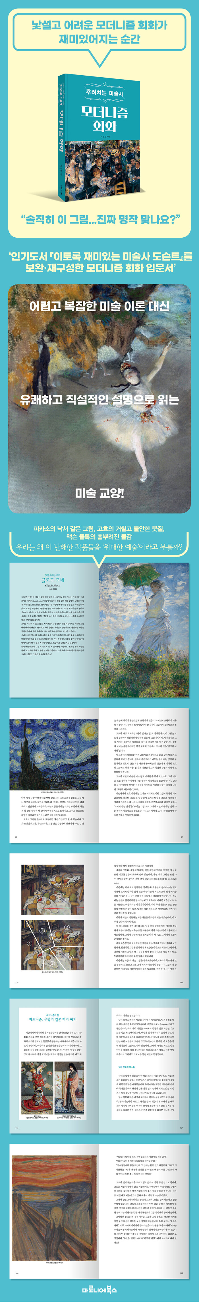 특히 이 책은 2023년에 출간되어 독자들의 호응을 얻었던 『이토록 재미있는 미술사 도슨트』를 바탕으로, 내용을 보완하고 흐름을 더욱 정교하게 다듬어 새롭게 선보이는 책이다. 기존 도서의 강점이었던 ‘쉽고 재미있는 미술사’라는 특징은 그대로 살리면서, 모더니즘 회화를 보다 입체적으로 이해할 수 있도록 구성과 서술을 한층 강화했다. 또한 인기 팟캐스트 ‘후려치는 미술사’를 진행해온 저자의 강점을 살려, 복잡한 이론 대신 직설적이고 유쾌한 언어로 핵심을 전달하며 독자들이 자연스럽게 미술의 맥락을 이해하도록 돕는다.