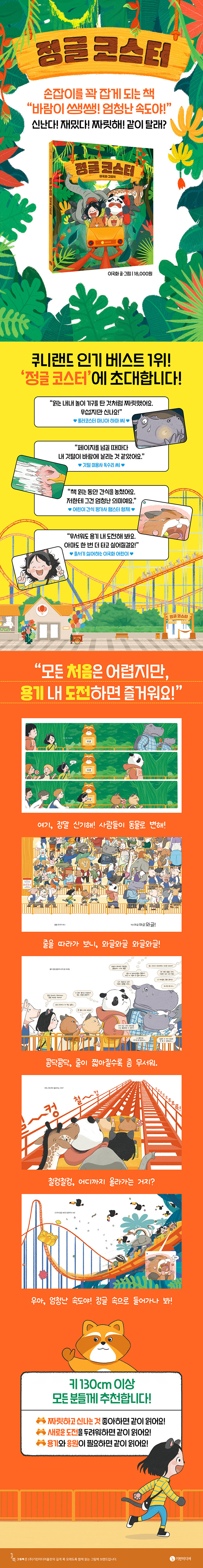 쿠니랜드 인기 1위 ‘정글 코스터’를 배경으로, 두려움과 설렘 사이에서 용기를 내는 순간을 그린 그림책이다. 호기심, 도전하는 마음, 용기를 준비해야 탈 수 있는 놀이기구 앞에서 망설이던 아이가 새로운 경험에 한 걸음 다가간다.