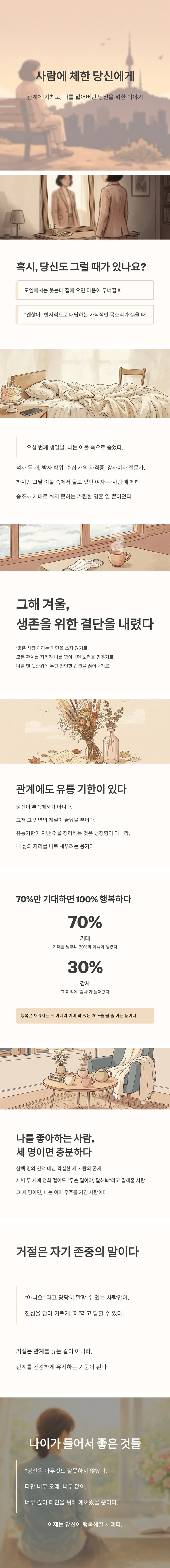 ‘좋은 사람’으로 살기 위해 자신을 지워온 시간과 그로 인해 쌓인 피로를 돌아보며, 관계의 유통기한을 인정하고 삶을 정리해 나간다. 연락처를 줄이고 모임에서 벗어나며 혼자 있는 시간을 배우는 과정 속에서, 타인을 위해 애써온 시간을 내려놓고 스스로를 회복해 가는 에세이다.